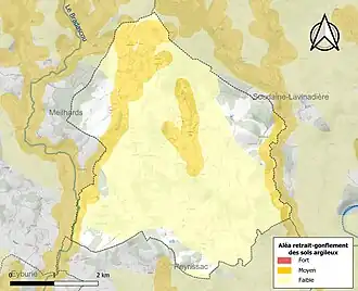 Le retrait-gonflement des sols argileux est susceptible d'engendrer des dommages importants aux bâtiments en cas d’alternance de périodes de sécheresse et de pluie. 22 % de la superficie communale est en aléa moyen ou fort (26,8 % au niveau départemental et 48,5 % au niveau national). Sur les 123 bâtiments dénombrés sur la commune en 2019, 30 sont en aléa moyen ou fort, soit 24 %, à comparer aux 36 % au niveau départemental et 54 % au niveau national. Une cartographie de l'exposition du territoire national au retrait gonflement des sols argileux est disponible sur le site du BRGM[15],[Carte 2].