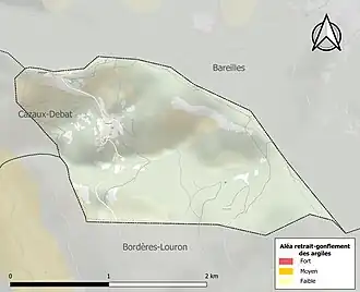 La commune est vulnérable au risque de mouvements de terrains constitué principalement du retrait-gonflement des sols argileux[28]. Cet aléa est susceptible d'engendrer des dommages importants aux bâtiments en cas d’alternance de périodes de sécheresse et de pluie. La totalité de la commune est en aléa faible (44,5 % au niveau départemental et 48,5 % au niveau national). Sur les 21 bâtiments dénombrés sur la commune en 2019, aucun n'est en aléa moyen ou fort, à comparer aux 75 % au niveau départemental et 54 % au niveau national. Une cartographie de l'exposition du territoire national au retrait gonflement des sols argileux est disponible sur le site du BRGM[29],[Carte 3].