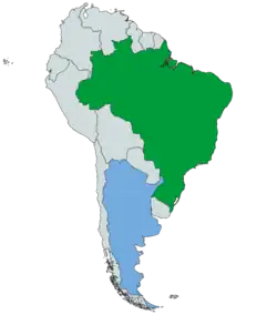 Carte des deux pays : le Brésil en vert, l'Argentine en bleu.