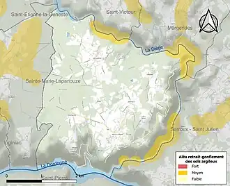 Le retrait-gonflement des sols argileux est susceptible d'engendrer des dommages importants aux bâtiments en cas d’alternance de périodes de sécheresse et de pluie. 6,3 % de la superficie communale est en aléa moyen ou fort (26,8 % au niveau départemental et 48,5 % au niveau national). Sur les 98 bâtiments dénombrés sur la commune en 2019, aucun n'est en aléa moyen ou fort, à comparer aux 36 % au niveau départemental et 54 % au niveau national. Une cartographie de l'exposition du territoire national au retrait gonflement des sols argileux est disponible sur le site du BRGM[15],[Carte 2].