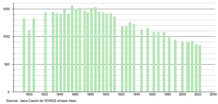 L'évolution du nombre d'habitants est connue à travers les recensements de la population effectués dans la commune depuis 1793. Pour les communes de moins de 10 000 habitants, une enquête de recensement portant sur toute la population est réalisée tous les cinq ans, les populations de référence des années intermédiaires étant quant à elles estimées par interpolation ou extrapolation[27]. Pour la commune, le premier recensement exhaustif entrant dans le cadre du nouveau dispositif a été réalisé en 2007[28].