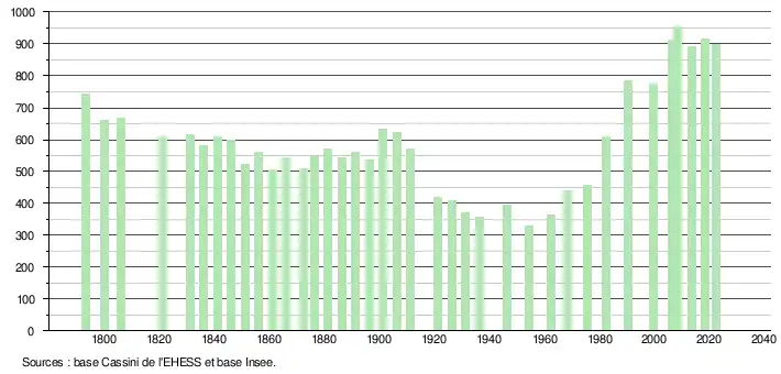 L'évolution du nombre d'habitants est connue à travers les recensements de la population effectués dans la commune depuis 1793. Pour les communes de moins de 10 000 habitants, une enquête de recensement portant sur toute la population est réalisée tous les cinq ans, les populations de référence des années intermédiaires étant quant à elles estimées par interpolation ou extrapolation[31]. Pour la commune, le premier recensement exhaustif entrant dans le cadre du nouveau dispositif a été réalisé en 2008[32].