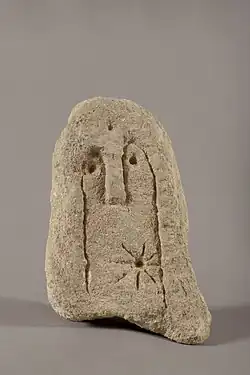 En 1960 et 1961, des fouilles dans la partie nord du rocher des Doms dirigées par Sylvain Gagnière ont mis au jour une petite stèle anthropomorphe (hauteur : 20 cm) qui fut trouvée dans une zone de terre remaniée[2]. Sculptée dans de la molasse burdigalienne, elle a la forme d'une « stèle funéraire » avec sa face gravée d'une figure humaine très stylisée et sans bouche dont les yeux sont marqués par des cupules. Sur la partie inférieure, décalée légèrement sur la droite, a été creusée une cupule profonde d'où partent huit traits formant une représentation solaire, découverte unique sur ce type de stèle.