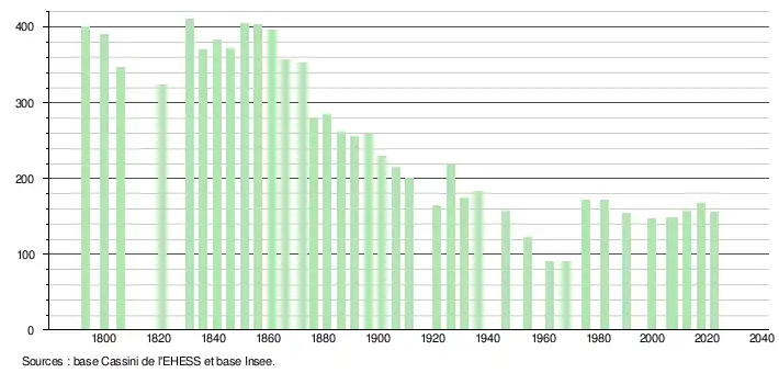 L'évolution du nombre d'habitants est connue à travers les recensements de la population effectués dans la commune depuis 1793. Pour les communes de moins de 10 000 habitants, une enquête de recensement portant sur toute la population est réalisée tous les cinq ans, les populations de référence des années intermédiaires étant quant à elles estimées par interpolation ou extrapolation[18]. Pour la commune, le premier recensement exhaustif entrant dans le cadre du nouveau dispositif a été réalisé en 2007[19].