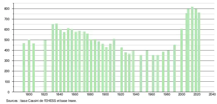 L'évolution du nombre d'habitants est connue à travers les recensements de la population effectués dans la commune depuis 1793. Pour les communes de moins de 10 000 habitants, une enquête de recensement portant sur toute la population est réalisée tous les cinq ans, les populations de référence des années intermédiaires étant quant à elles estimées par interpolation ou extrapolation[21]. Pour la commune, le premier recensement exhaustif entrant dans le cadre du nouveau dispositif a été réalisé en 2008[22].