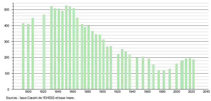 L'évolution du nombre d'habitants est connue à travers les recensements de la population effectués dans la commune depuis 1793. Pour les communes de moins de 10 000 habitants, une enquête de recensement portant sur toute la population est réalisée tous les cinq ans, les populations de référence des années intermédiaires étant quant à elles estimées par interpolation ou extrapolation[26]. Pour la commune, le premier recensement exhaustif entrant dans le cadre du nouveau dispositif a été réalisé en 2007[27].