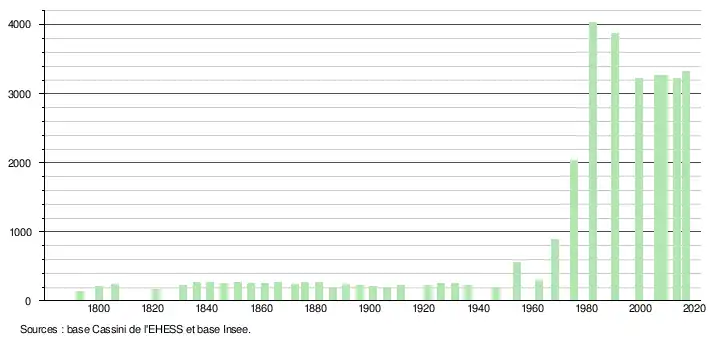 L'évolution du nombre d'habitants est connue à travers les recensements de la population effectués dans la commune depuis 1793. Pour les communes de moins de 10 000 habitants, une enquête de recensement portant sur toute la population est réalisée tous les cinq ans, les populations de référence des années intermédiaires étant quant à elles estimées par interpolation ou extrapolation[21]. Pour la commune, le premier recensement exhaustif entrant dans le cadre du nouveau dispositif a été réalisé en 2008[22].
