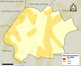 Le retrait-gonflement des sols argileux est susceptible d'engendrer des dommages importants aux bâtiments en cas d’alternance de périodes de sécheresse et de pluie. 41,8 % de la superficie communale est en aléa moyen ou fort (52,8 % au niveau départemental et 48,5 % au niveau national). Sur les 99 bâtiments dénombrés sur la commune en 2019, 34 sont en aléa moyen ou fort, soit 34 %, à comparer aux 70 % au niveau départemental et 54 % au niveau national. Une cartographie de l'exposition du territoire national au retrait gonflement des sols argileux est disponible sur le site du BRGM[17],[Carte 2].