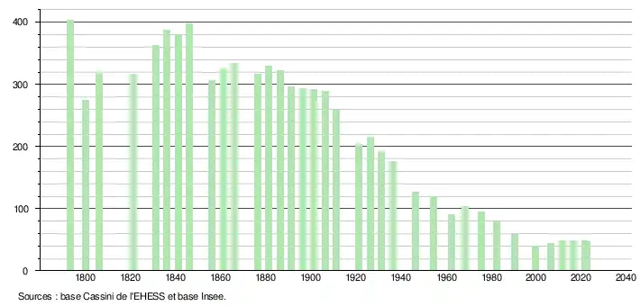 L'évolution du nombre d'habitants est connue à travers les recensements de la population effectués dans la commune depuis 1793. Pour les communes de moins de 10 000 habitants, une enquête de recensement portant sur toute la population est réalisée tous les cinq ans, les populations de référence des années intermédiaires étant quant à elles estimées par interpolation ou extrapolation[37]. Pour la commune, le premier recensement exhaustif entrant dans le cadre du nouveau dispositif a été réalisé en 2006[38].