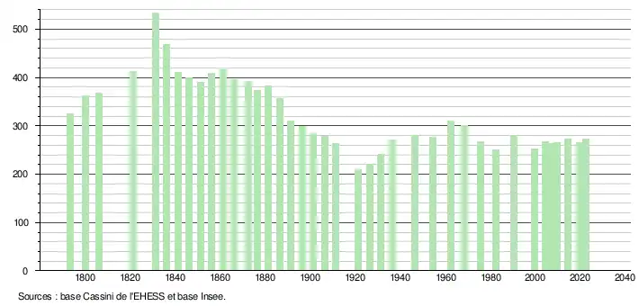 L'évolution du nombre d'habitants est connue à travers les recensements de la population effectués dans la commune depuis 1793. Pour les communes de moins de 10 000 habitants, une enquête de recensement portant sur toute la population est réalisée tous les cinq ans, les populations de référence des années intermédiaires étant quant à elles estimées par interpolation ou extrapolation[23]. Pour la commune, le premier recensement exhaustif entrant dans le cadre du nouveau dispositif a été réalisé en 2004[24].