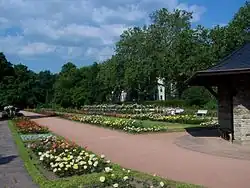 Dans la partie avant du jardin, deux diagonales aux angles sont plantées d'érables palmés et d'érables pourpres et sont fleuries de lilas en mai. Quatre putti de pierre calcaire, sculptés par Max Hermann Fritz en marquent l'entrée. Ils représentent les saisons.