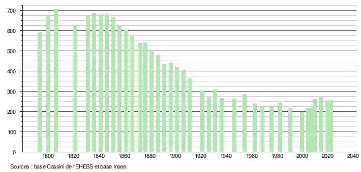 L'évolution du nombre d'habitants est connue à travers les recensements de la population effectués dans la commune depuis 1793. Pour les communes de moins de 10 000 habitants, une enquête de recensement portant sur toute la population est réalisée tous les cinq ans, les populations de référence des années intermédiaires étant quant à elles estimées par interpolation ou extrapolation[16]. Pour la commune, le premier recensement exhaustif entrant dans le cadre du nouveau dispositif a été réalisé en 2004[17].