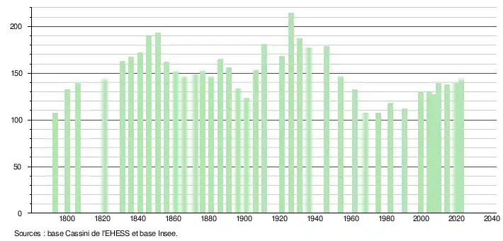 L'évolution du nombre d'habitants est connue à travers les recensements de la population effectués dans la commune depuis 1793. Pour les communes de moins de 10 000 habitants, une enquête de recensement portant sur toute la population est réalisée tous les cinq ans, les populations de référence des années intermédiaires étant quant à elles estimées par interpolation ou extrapolation[16]. Pour la commune, le premier recensement exhaustif entrant dans le cadre du nouveau dispositif a été réalisé en 2004[17].