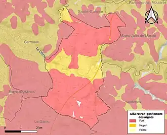 La commune est vulnérable au risque de mouvements de terrains constitué principalement du retrait-gonflement des sols argileux[23]. Cet aléa est susceptible d'engendrer des dommages importants aux bâtiments en cas d’alternance de périodes de sécheresse et de pluie. 99,3 % de la superficie communale est en aléa moyen ou fort (76,3 % au niveau départemental et 48,5 % au niveau national). Sur les 371 bâtiments dénombrés sur la commune en 2019, 370 sont en aléa moyen ou fort, soit 100 %, à comparer aux 90 % au niveau départemental et 54 % au niveau national. Une cartographie de l'exposition du territoire national au retrait gonflement des sols argileux est disponible sur le site du BRGM[24],[Carte 3].