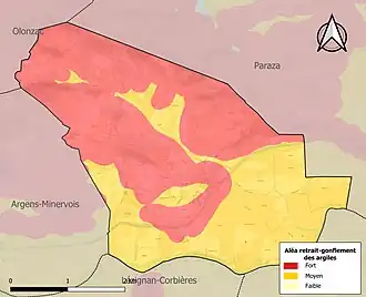 Le retrait-gonflement des sols argileux est susceptible d'engendrer des dommages importants aux bâtiments en cas d’alternance de périodes de sécheresse et de pluie. La totalité de la commune est en aléa moyen ou fort (75,2 % au niveau départemental et 48,5 % au niveau national). Sur les 305 bâtiments dénombrés sur la commune en 2019, 305 sont en aléa moyen ou fort, soit 100 %, à comparer aux 94 % au niveau départemental et 54 % au niveau national. Une cartographie de l'exposition du territoire national au retrait gonflement des sols argileux est disponible sur le site du BRGM[24],[Carte 3].