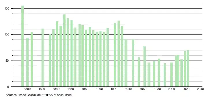 L'évolution du nombre d'habitants est connue à travers les recensements de la population effectués dans la commune depuis 1793. Pour les communes de moins de 10 000 habitants, une enquête de recensement portant sur toute la population est réalisée tous les cinq ans, les populations de référence des années intermédiaires étant quant à elles estimées par interpolation ou extrapolation[24]. Pour la commune, le premier recensement exhaustif entrant dans le cadre du nouveau dispositif a été réalisé en 2008[25].