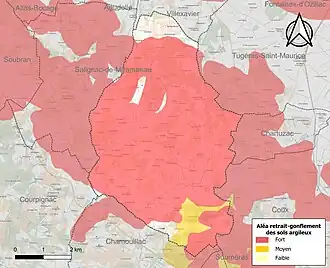 Le retrait-gonflement des sols argileux est susceptible d'engendrer des dommages importants aux bâtiments en cas d’alternance de périodes de sécheresse et de pluie. 92,7 % de la superficie communale est en aléa moyen ou fort (54,2 % au niveau départemental et 48,5 % au niveau national). Sur les 257 bâtiments dénombrés sur la commune en 2019, 239 sont en aléa moyen ou fort, soit 93 %, à comparer aux 57 % au niveau départemental et 54 % au niveau national. Une cartographie de l'exposition du territoire national au retrait gonflement des sols argileux est disponible sur le site du BRGM[10],[Carte 2].