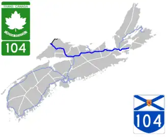 La route 104 est une route du nord de la Nouvelle-Écosse. Elle fait partie de la route Transcanadienne sur la majeure partie de son parcours. Avec sa longueur totale de319,4 km (198,5 mi), elle est la plus longue autoroute de la Nouvelle-Écosse. La route 104 adopte plusieurs formes, une autoroute, une autoroute à une seule chaussée et une route de transit avec deux voies et intersections à niveaux.