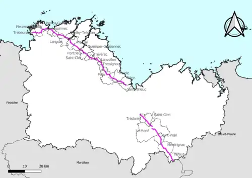 L'itinéraire traverse 33 communes qui sont (classées alphabétiquement) : Coatréven - Illifaut - Kermaria-Sulard - La Roche-Jaudy - Langoat - Lannebert - Lanvollon - Le Faouët - Le Mené - Louannec - Merdrignac - Minihy-Tréguier - Perros-Guirec - Plélo - Plérin - Pleumeur-Bodou - Ploëzal - Pontrieux - Pordic - Quemper-Guézennec - Saint-Brieuc - Saint-Clet - Saint-Glen - Saint-Gilles-les-Bois - Saint-Vran - Trébeurden - Trébry - Trédaniel - Trégomeur - Tréguidel - Tréméven - Tressignaux - Trévérec.