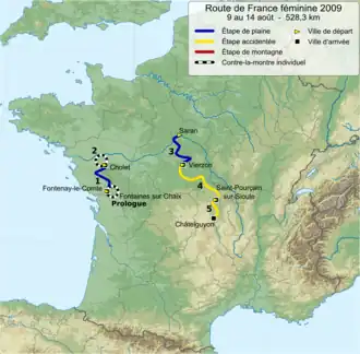 La course débute à Fontaines-Chaix par un prologue. Le lendemain, l'étape démarre à Fontenay-le-Comte, jusqu'à côté de Fontaines-Chaix, et se rend à Cholet. La deuxième étape est un contre-la-montre autour de cette dernière ville. Après un transfert, la troisième étape relie Saran, près d'Orléans, à Vierzon. Les deux dernières étapes sont plus vallonnées. La première va de Vierzon à Saint-Pourçain-sur-Sioule, la seconde y démarre pour se rendre à Châtelguyon[1].