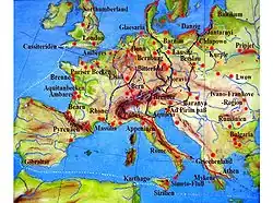 - Germanie. - Plusieurs routes connectaient la Mer du Nord à la Méditerranée. L'une empruntait l'Elbe et rejoignait Carnuntum par les villes d'Olmütz (Eburum) et Brno (Bruna). L'autre longeait la côte de la Mer du Nord par le pays des Bataves (sites de Baarn, Barneveld, Amersfoort et Amerongen) jusqu'à Amberes (l'actuelle Anvers), rattrapait Braine-l’Alleud et Braine-le-Comte, puis suivait la Meuse. Berne était un carrefour de routes venant des vallées du Rhône et du Rhin, et allant vers la plaine de Lombardie.