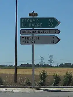 Panneau indicateur de la RN 29 entre Tôtes et Bourdainville