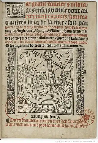 - Pierre Garcie dit Ferrande rédige à la fin du XVe siècle (écrit avant 1483 et imprimé en 1520) le premier routier connu sous le titre Le Grand Routier de la mer[17]. Il décrit les côtes depuis les Flandres jusqu'au sud de l'Espagne. Cet ouvrage sera imprimé jusqu'en 1662 sur la base de cette première édition : Pierre Garcie dit-Ferrande, Le Grant routier et pilotage et enseignement pour ancrer tant ès ports, havres que autres lieux de la mer, (lire en ligne).