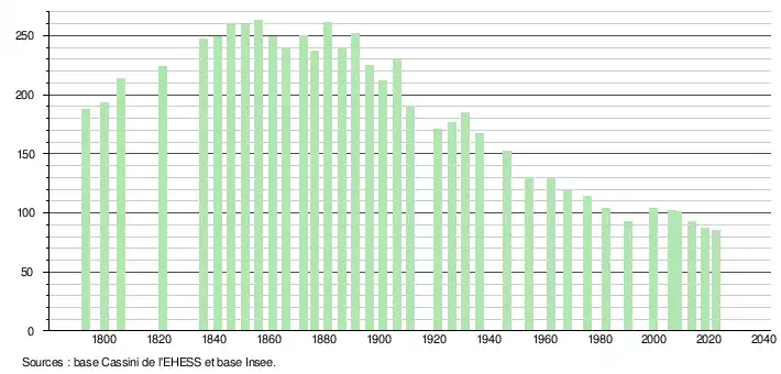 L'évolution du nombre d'habitants est connue à travers les recensements de la population effectués dans la commune depuis 1793. Pour les communes de moins de 10 000 habitants, une enquête de recensement portant sur toute la population est réalisée tous les cinq ans, les populations de référence des années intermédiaires étant quant à elles estimées par interpolation ou extrapolation[13]. Pour la commune, le premier recensement exhaustif entrant dans le cadre du nouveau dispositif a été réalisé en 2008[14].