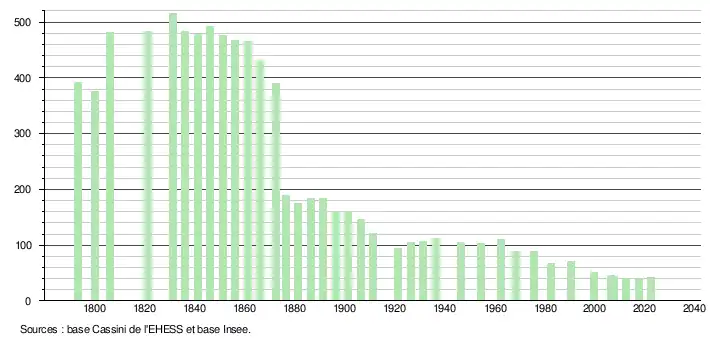 L'évolution du nombre d'habitants est connue à travers les recensements de la population effectués dans la commune depuis 1793. Pour les communes de moins de 10 000 habitants, une enquête de recensement portant sur toute la population est réalisée tous les cinq ans, les populations de référence des années intermédiaires étant quant à elles estimées par interpolation ou extrapolation[30]. Pour la commune, le premier recensement exhaustif entrant dans le cadre du nouveau dispositif a été réalisé en 2007[31].