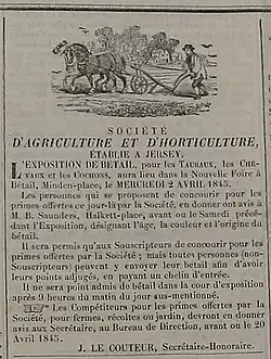 La Royal Jersey Agricultural and Horticultural Society a été créée, le 26 août 1833, pour encourager le développement de l’Agriculture et de l’Horticulture. Elle a exercé et accompli encore, une influence importante tant par l’émulation qu’elle a créée que par l’instruction qu’elle a donnée aux agriculteurs et horticulteurs de cette île[1].