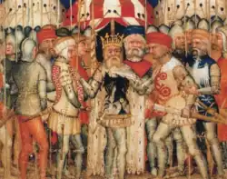 - À la mort de l'empereur Henri II en 1024, la noblesse lombarde, dirigée par le marquis de Turin, Manfred II, fit appel au roi des Francs Robert II, lui offrant la couronne à lui ou à son fils, Hugues. Ayant essuyé une fin de non-recevoir, leurs envoyés se rendirent à la cour du duc d'Aquitaine Guillaume V, qui marié à une petite-fille du roi Adalbert, accepta la couronne pour son fils homonyme Guillaume[11]. Cependant, le projet échoua à cause des demandes excessives de la noblesse lombarde.