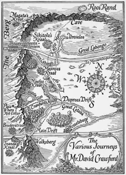 Carte obtenue à partir du scan du roman Prester John (1910), écrit par John Buchan et illustré par Henry Clarence Pitz.Dans Le Prêtre Jean(en) de John Buchan (1910), l'héritage supposé du prêtre Jean sert de point de départ au roman.