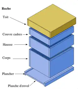 Les ruches verticales à cadres sont constituées d'un empilement de caissons ouverts au-dessus et en dessous dans lesquels sont emboîtés des cadres qui peuvent être déplacés indépendamment les uns des autres. On distingue :