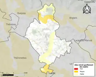 Le retrait-gonflement des sols argileux est susceptible d'engendrer des dommages importants aux bâtiments en cas d’alternance de périodes de sécheresse et de pluie. 9,4 % de la superficie communale est en aléa moyen ou fort (67,7 % au niveau départemental et 48,5 % au niveau national). Sur les 128 bâtiments dénombrés sur la commune en 2019, 1 sont en aléa moyen ou fort, soit 1 %, à comparer aux 72 % au niveau départemental et 54 % au niveau national. Une cartographie de l'exposition du territoire national au retrait gonflement des sols argileux est disponible sur le site du BRGM[21],[Carte 2].