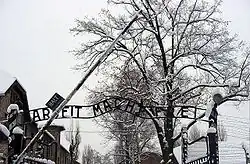 Richard Glücks, qui a succédé à Theodor Eicke en tant qu'inspecteur des camps de concentration, nomme Höss commandant du nouveau camp d'Auschwitz[35], dont la création a été décidée le . Höss et une poignée de gardes SS y arrivent le [35], suivis, le [36], par les premiers internés, 30 criminels allemands de droit commun transférés de Sachsenhausen pour remplir la fonction de Kapo[37]. Après un renforcement de la garde par 120 SS provenant notamment des camps de Buchenwald, Dachau et Flossenburg[36], 728 détenus politiques polonais arrivent au camp le [38]. Comme à Dachau et Sachsenhausen, Höss fait apposer sur le portail d'entrée du camp la devise Arbeit macht Frei (le travail rend libre)[29]. Dès le , Höss demande au responsable des constructions un rapport hebdomadaire sur l'état d'avancement des travaux visant à alimenter le camp en eau potable, à évacuer les eaux usées et à drainer les terres marécageuses[39].