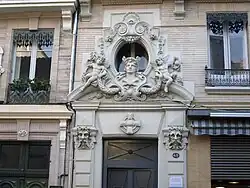 L'immeuble est construit dans la deuxième moitié du XIXe siècle par l'architecte Étienne Gazagne dans un style éclectique caractéristique du goût de l'époque. La façade, construite en brique claire, s'élève sur cinq niveaux : un rez-de-chaussée, un entresol et trois étages. Le rez-de-chaussée est percé de grandes ouvertures de boutique rectangulaires. À gauche, la porte piétonne a reçu un riche décor en pierre : elle est encadrée de pilastres à bossages dont les chapiteaux portent des mascarons d'hommes barbus, et surmontée au niveau de l'entresol d'un fronton curviligne, sur lequel s'appuient deux putti, qui encadrent un buste de Mercure casqué. La lucarne ovale est encadrée d'un décor de guirlandes de fleurs et de grappes de raisin. Le 1er étage est mis en valeur par un balcon continu, le 2e étage par des balconnets, qui portent des garde-corps en fonte[48].
