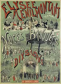 L'Élysée-Ménilmontant a continué les traditions de l'île d'Amour ; son vaste jardin, planté d'arbres séculaires, ses mille becs de gaz, son splendide salon de 600 couverts très propice aux grandes noces, aux repas de corps, aux bals publics, en font un séjour enchanteur, très recherché par la jeunesse folâtre et bruyante.