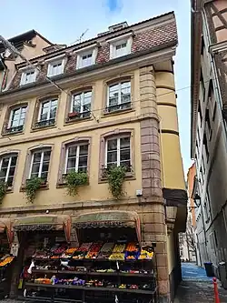 - Sur un emplacement cité dès 1427, à l'angle de l'actuelle Grand-Rue, l'immeuble a été construit par un boulanger au milieu du XVIIIe siècle[15]. La façade de l'édifice qui donne sur la Grand-Rue se caractérise par un chaînage d'angle à refends, des encadrements de fenêtres en grès et des linteaux de fenêtres cintrés[16]. Dans l'étroite ruelle, la façade latérale à encorbellement est dotée de colombages.