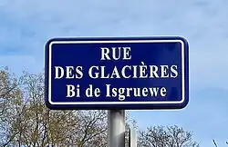 À partir de 1995, des plaques de rues bilingues, à la fois en français et en alsacien, sont mises en place par la municipalité lorsque les noms de rue traditionnels étaient encore en usage dans le parler strasbourgeois[4]. Le nom de la rue est alors sous-titré Bi de Isgruewe [allemand : Bei der Eisgruben].