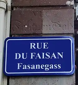 Des plaques de rues bilingues, à la fois en français et en alsacien, sont mises en place par la municipalité à partir de 1995[3]. C'est le cas de la Fasanegass, littéralement « ruelle du Faisan ».