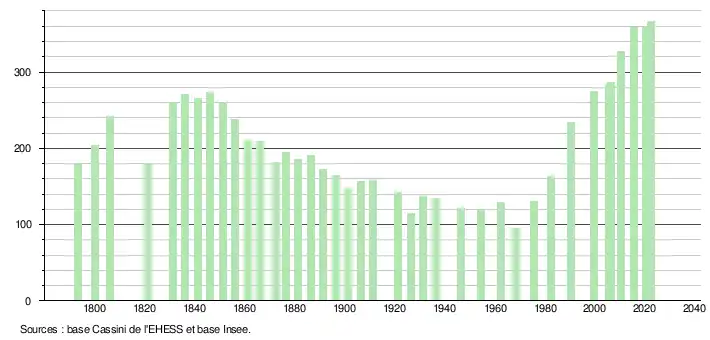 L'évolution du nombre d'habitants est connue à travers les recensements de la population effectués dans la commune depuis 1793. Pour les communes de moins de 10 000 habitants, une enquête de recensement portant sur toute la population est réalisée tous les cinq ans, les populations de référence des années intermédiaires étant quant à elles estimées par interpolation ou extrapolation[17]. Pour la commune, le premier recensement exhaustif entrant dans le cadre du nouveau dispositif a été réalisé en 2005[18].