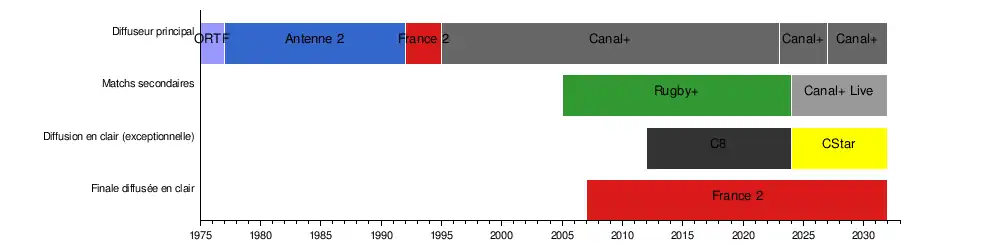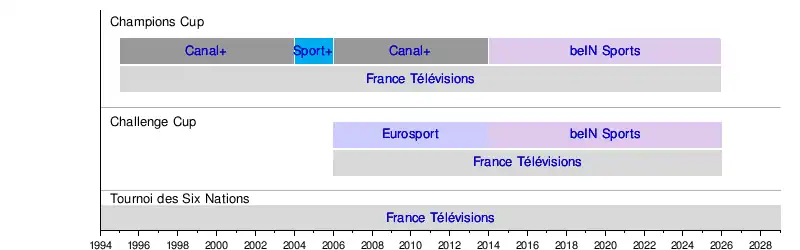| France Télévisions | 1992-1995 | Le 15 février 1992 dans Le Tournoi des Cinq Nations France-Angleterre est diffusée en clair sur TF1 et en crypté sur Canal+ puis rediffusée pour la nuit toujours en clair sur Antenne 2 et le , à l'occasion de la finale du Championnat de France 1992, France Télévision signe avec la FFR un contrat d'exclusivité sur 3 ans couvrant le Tournoi des Cinq Nations, les matches internationaux du XV de France (incluant les tournées à l'étranger) et le championnat de France[36]. |