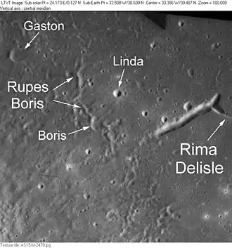 Le Rupes Boris et les cratères Boris, Delisle, Gaston et Linda.