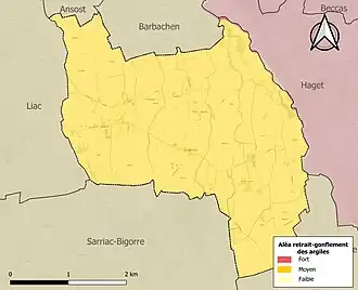 Le retrait-gonflement des sols argileux est susceptible d'engendrer des dommages importants aux bâtiments en cas d’alternance de périodes de sécheresse et de pluie. La totalité de la commune est en aléa moyen ou fort (44,5 % au niveau départemental et 48,5 % au niveau national). Sur les 44 bâtiments dénombrés sur la commune en 2019, 44 sont en aléa moyen ou fort, soit 100 %, à comparer aux 75 % au niveau départemental et 54 % au niveau national. Une cartographie de l'exposition du territoire national au retrait gonflement des sols argileux est disponible sur le site du BRGM[22],[Carte 3].