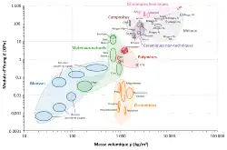 Le premier diagramme à droite montre la masse volumique et le module d'Young, sur une échelle linéaire. Le deuxième diagramme montre les mêmes attributs de matériaux sur une échelle log-log. Les familles de matériaux (polymères, mousses, métaux, etc.) sont identifiées par des couleurs.