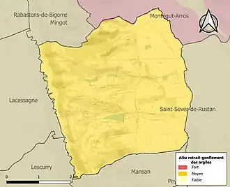 Le retrait-gonflement des sols argileux est susceptible d'engendrer des dommages importants aux bâtiments en cas d’alternance de périodes de sécheresse et de pluie. La totalité de la commune est en aléa moyen ou fort (44,5 % au niveau départemental et 48,5 % au niveau national). Sur les 129 bâtiments dénombrés sur la commune en 2019, 129 sont en aléa moyen ou fort, soit 100 %, à comparer aux 75 % au niveau départemental et 54 % au niveau national. Une cartographie de l'exposition du territoire national au retrait gonflement des sols argileux est disponible sur le site du BRGM[16],[Carte 2].