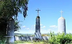 - Les trois croix latine représente le calvaire (le crucifix et les deux croix des Larrons).