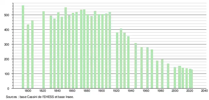 L'évolution du nombre d'habitants est connue à travers les recensements de la population effectués dans la commune depuis 1793. Pour les communes de moins de 10 000 habitants, une enquête de recensement portant sur toute la population est réalisée tous les cinq ans, les populations de référence des années intermédiaires étant quant à elles estimées par interpolation ou extrapolation[25]. Pour la commune, le premier recensement exhaustif entrant dans le cadre du nouveau dispositif a été réalisé en 2005[26].
