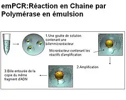 L’ADN simple brin est mis en contact avec des billes sur lesquelles sont fixées par l’extrémité 5’ des amorces A (billes A) ou B (billes B) respectivement complémentaires de la séquence de l’un ou l’autre des adaptateurs. En respectant un ratio nombre de molécules d’ADN/nombre de billes, on va fixer un seul fragment d’ADN sur chaque bille. Les billes sont ensuite mises dans une émulsion contenant les composés nécessaires à la réaction de polymérisation en chaîne et permettant d’individualiser chaque bille. Chaque goutte d’émulsion devient un microréacteur dans lequel l’unique fragment d’ADN fixé sur la bille va pouvoir être amplifié. En prenant l’exemple des billes B, au cours du premier cycle de PCR, l’amorce B associée au fragment d’ADN initial va assurer la synthèse de son brin complémentaire. Au cycle suivant, après dénaturation, la molécule d’ADN simple néo-synthétisée reste fixée sur la bille et va être utilisée pour la synthèse d’une autre matrice à partir de l’amorce A présente dans le milieu réactionnel. La molécule d’ADN simple brin de départ est quant à elle réutilisée par une autre amorce B fixée sur la bille. Après plusieurs cycles de PCR la bille est ainsi recouverte de plusieurs millions de molécules d’ADN simple brin identiques fixées par l’amorce B et orientées 5’ → 3’ de la bille vers l’extérieur.