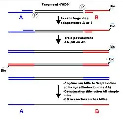 Les adaptateurs sont ajoutés à l’ADN en présence de ligase. Pour éviter l’association de plusieurs molécules d’adaptateurs entre elles celles-ci sont dé-phosphorylées sur leurs extrémités 5’. La ligature n’étant pas orientée, les fragments d’ADN peuvent être bornés par deux adaptateurs A, deux adaptateurs B ou un de chaque. Seuls les fragments correspondant à ce dernier cas de figure pourront être amplifiés lors de l’étape suivante et donc par la suite séquencés. Afin de purifier ce type de fragment, l’adaptateur B est biotinylé sur l’un de ses brins. Les fragments sont ensuite mis en contact avec des billes sur lesquelles se trouve de la streptavidine. Les fragments uniquement bornés par deux adaptateurs A ne pourront donc pas être récupérés sur ces billes et seront donc éliminés. L’ADN fixé sur ces billes subit alors une dénaturation et seuls les molécules d’ADN simple brin bornées par un adaptateur A et un adaptateur B pourront se décrocher des billes. En effet, les deux brins d’ADN des molécules possédant deux adaptateurs B restent piégés par les billes.